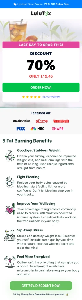 Get the authentic Lulutox Detox Tea directly from the official store. We are currently offering a seasonal promotion with up to 70% off on all orders. Experience the premium quality of our carefully selected ingredients designed for your wellness.